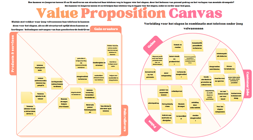 Het probleem dat we uiteindelijk hadden vastgesteld, was de slechte slaap die veel mensen ervaren door telefoongebruik, zowel ’s avonds als overdag. Omdat ik me sterk betrokken voelde bij dit onderwerp, vond ik het logisch om jongeren, of young professionals, zoals we de doelgroep hebben gedefinieerd, centraal te stellen. Deze keuze maakte het voor mij ook makkelijker om me in te leven in de gebruiker, omdat dit leeftijdsgenoten zijn die vergelijkbare routines en uitdagingen hebben. Om de behoeften van deze doelgroep goed te begrijpen, heb ik meerdere jongeren geïnterviewd en op verschillende momenten geobserveerd hoe zij met hun telefoon en slaapgedrag omgaan. Door het gesprek met hen aan te gaan en door te vragen naar hun dagelijkse gewoontes, frustraties (pains), gewenste verbeteringen (gains) en wat zij proberen te bereiken in hun avondroutine (jobs-to-be-done), kregen we betrouwbare en valide gegevens. Deze inzichten lieten duidelijke patronen zien, zoals het onbewust blijven scrollen voor het slapengaan en het gebruik van de telefoon als ontspanningsmiddel. Op basis van deze verzamelde input konden we meerdere inzichten formuleren die direct aansloten bij wat de doelgroep nodig heeft. Hierdoor waren we in staat om een scherpe en onderbouwde onderzoeksvraag te formuleren. Tijdens de eerste pitstop kwamen we tot de vraag: "Hoe kunnen we Young Professionals  tussen 18 en 35 motiveren om structureel hun telefoon weg te leggen vóór het slapen, door het belonen van gezond gedrag en het verlagen van mentale drempels?". Deze vraag sloot goed aan bij de behoeften en problemen die gebruikers eerder hadden benoemd. De feedback op deze onderzoeksvraag was zeer positief, omdat de vraag duidelijk voortkwam uit de interviews en observaties. Tijdens diezelfde pitstop hebben we de vraag nog licht aangescherpt, wat ik zelf een waardevolle en logische verbetering vond. Vanuit deze definitieve onderzoeksvraag hebben we vervolgens meerdere concepten ontwikkeld die inspelen op de daadwerkelijke behoeften van de doelgroep.