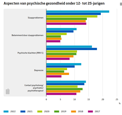 De grafiek hieronder vormde voor mij een belangrijke aanvulling op de deskresearch. Toen ik deze cijfers zag, schrok ik van de stijgende trend in slaapproblemen en psychische klachten onder jongeren en jongvolwassenen. Vooral de duidelijke toename van slaap gerelateerde problemen in de afgelopen jaren bevestigde voor mij hoe urgent dit onderwerp is. Deze statistieken maakten het kiezen van een doelgroep dan ook een stuk eenvoudiger. De data laat zien dat jongeren en young professionals bovengemiddeld vaak worstelen met slaaptekort, belemmeringen door slaap, en psychische klachten die hier mogelijk mee samenhangen. Dit zorgde ervoor dat wij als projectgroep overtuigd raakten dat we juist deze groep wilden helpen. De grafiek onderstreepte niet alleen de relevantie van het probleem, maar gaf ons ook een stevig, feitelijk fundament om onze ontwerpkeuzes op te baseren. Hierdoor konden we met meer vertrouwen verder bouwen aan ons concept en onze uiteindelijke probleemstelling.